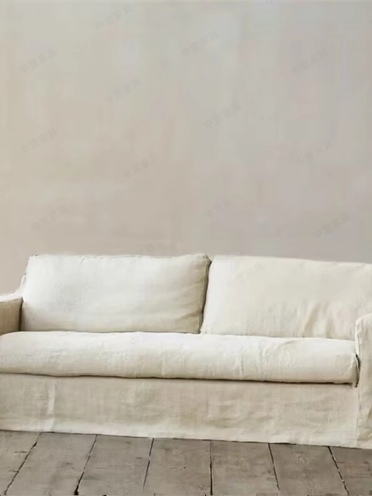 侘寂スタイルの風水デザイン、洗えるリネンソファ - アメリカンヴィンテージの魅力、シンプルでスタイリッシュな3人掛けリビングソファ。心地よいくつろぎ空間を提供します!