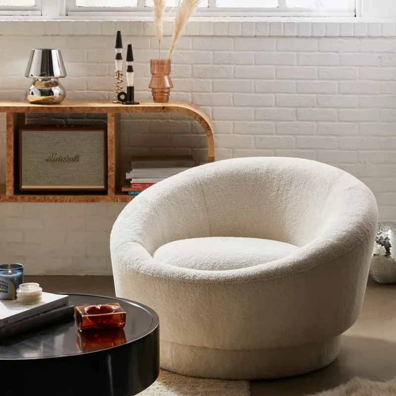 デザイナーによるユニークなシープボア生地の1人掛けソファ、モダンな北欧スタイルの軽やかなラグジュアリー、リビングやバルコニーにぴったりのリラックスチェア!快適なくつろぎを実現します!