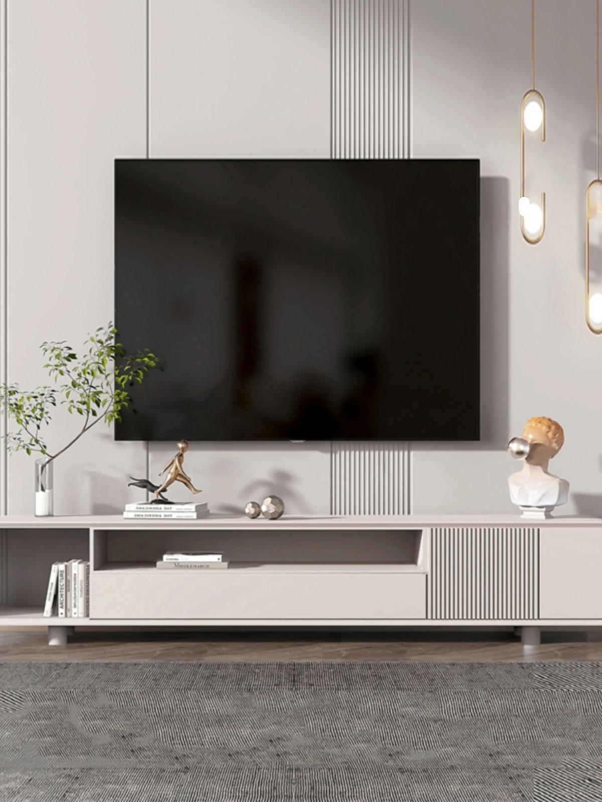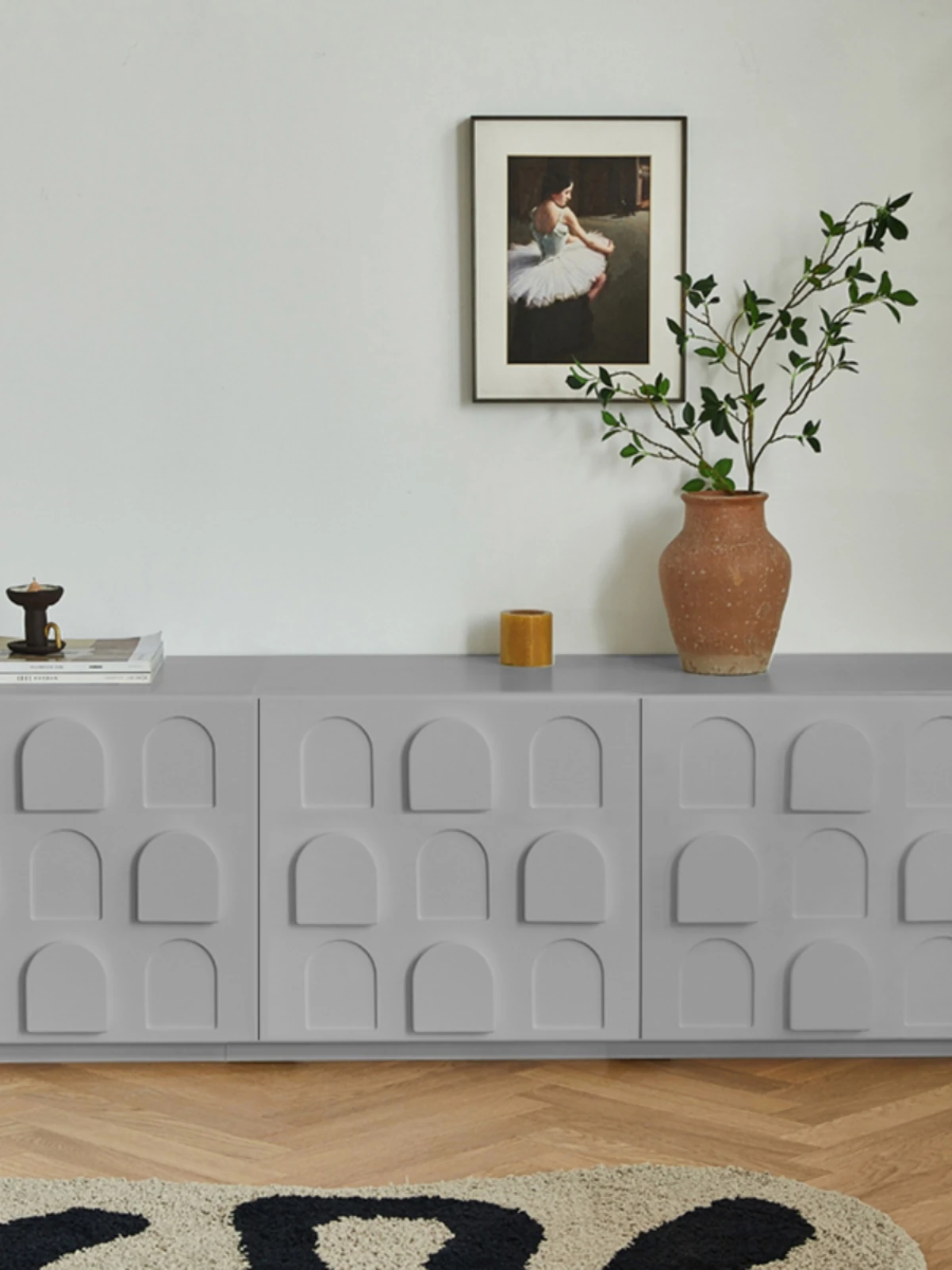 Scandinavian Minimalist TV Stand - Chic Lacquered Media Console in Wabi-Sabi Style, Space-Saving Wall-Mounted Curved Design for Small Living Rooms