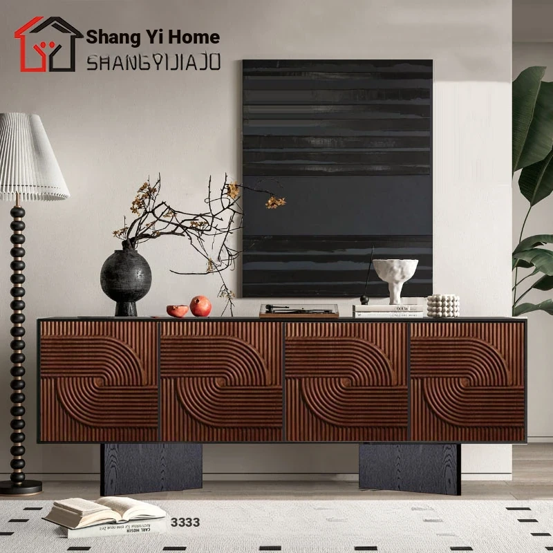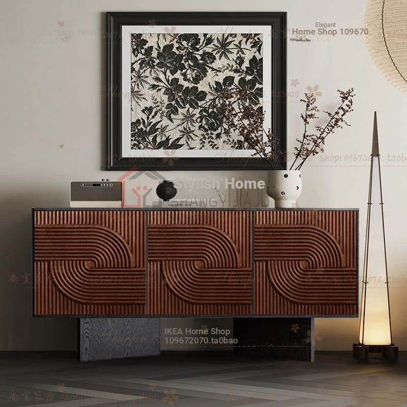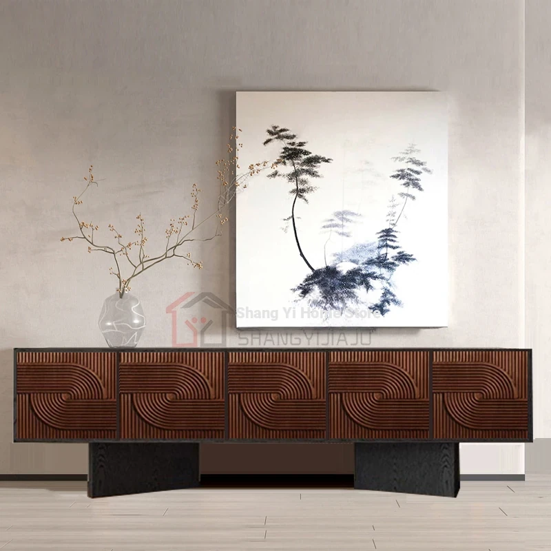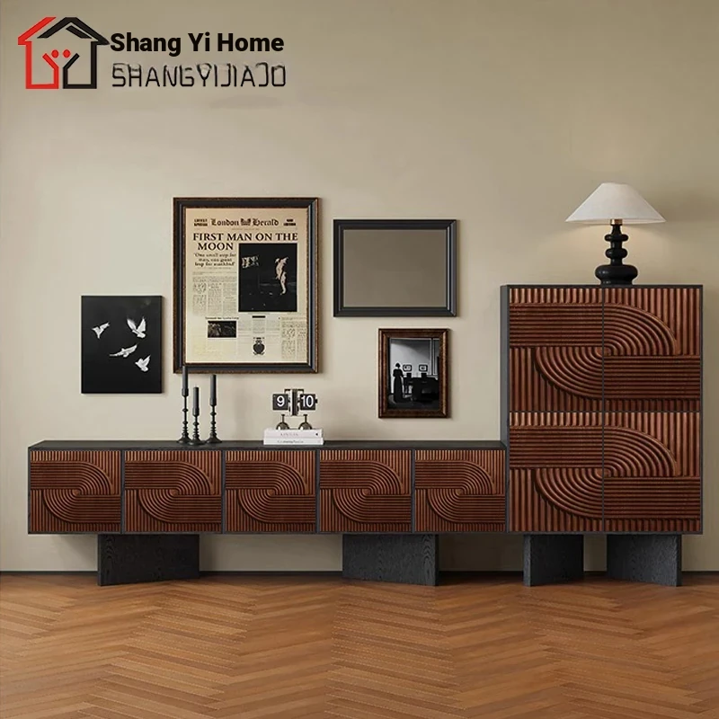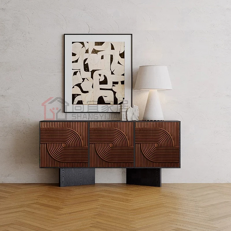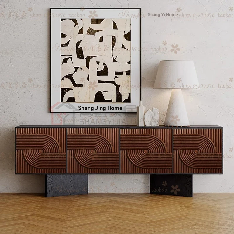 レトロな無垢材のダイニングサイドボード|アメリカンアートスタイルの玄関キャビネット|個性的なデザインのリビングテレビボード|収納力抜群のサイドキャビネット